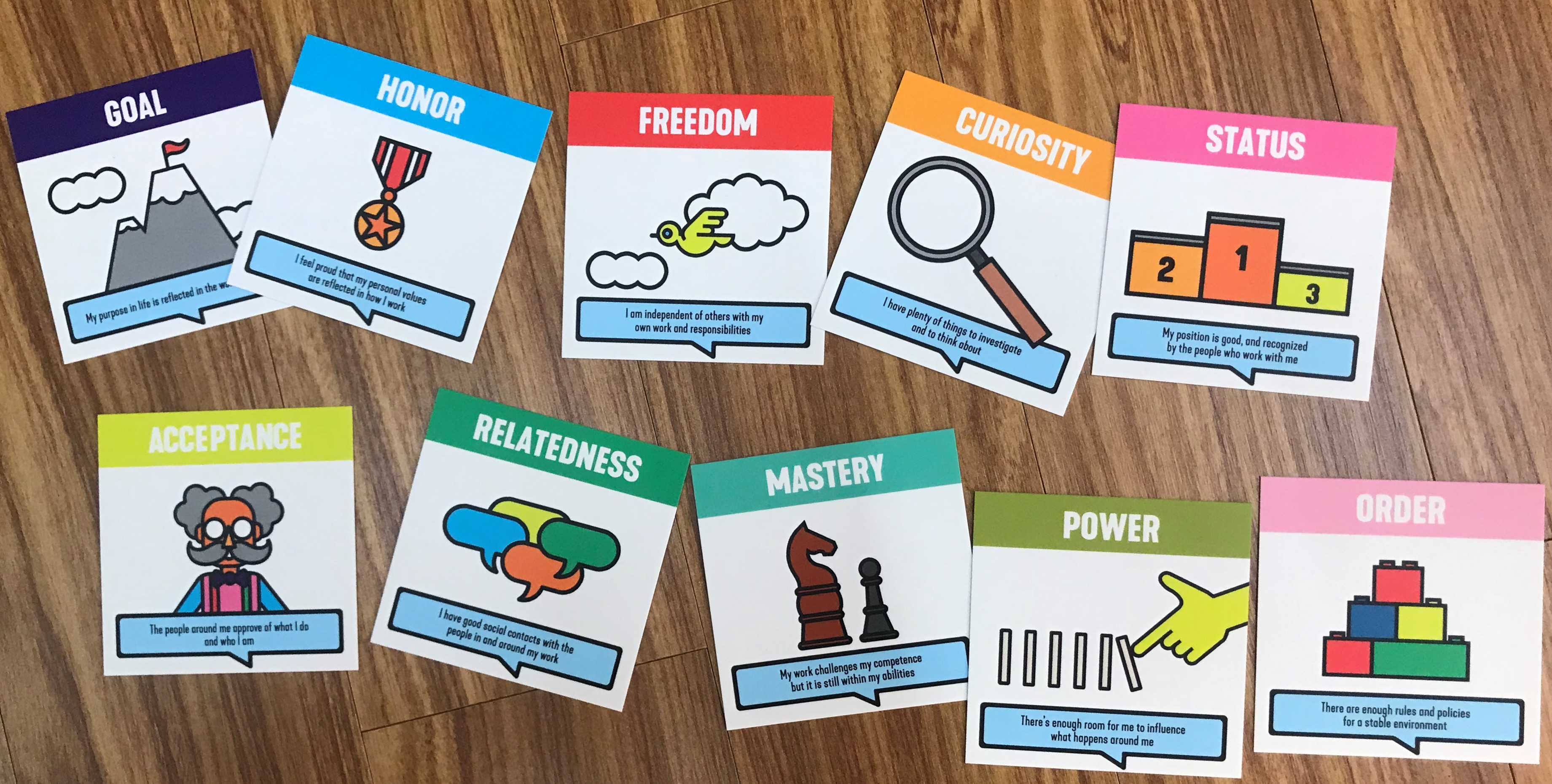 Moving Motiviator는 10장의 카드로 이루어져 있습니다. 그리고 각 카드들은 내잭적 동기를 나타내고 10가지 동기는 다음과 같습니다.