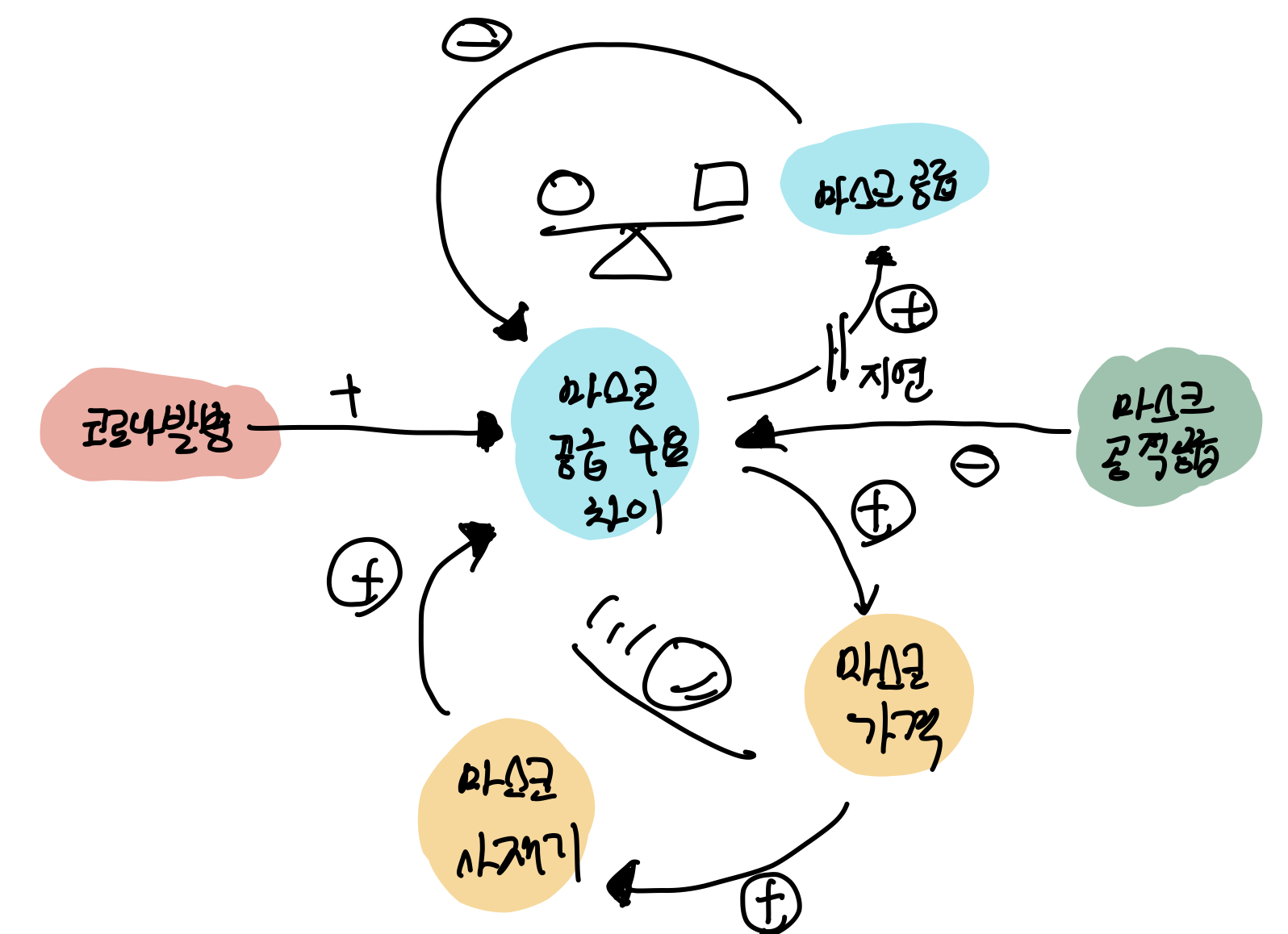 아래 그림은 독서 모임에서 그렸던 코로나 사태로 바라본 마스크 가격 분석 다이어그램입니다. 독서모임에 참석하셨던 분들이 모두 제각각의 다어이그램을 그렸던 기억이 있습니다. 사람들마다 요소들을 어떻게 정의하느냐에 어느정도의 깊이 있는 사고를 하느냐에 따라서 다른 그림이 그려집니다.