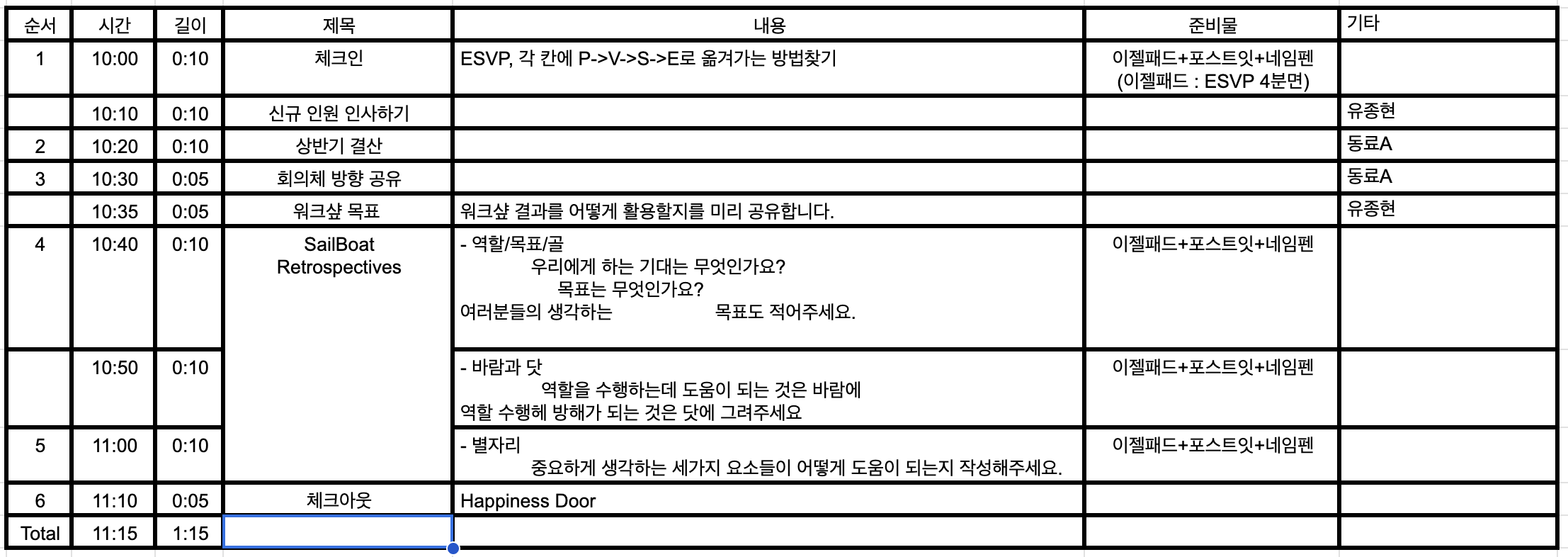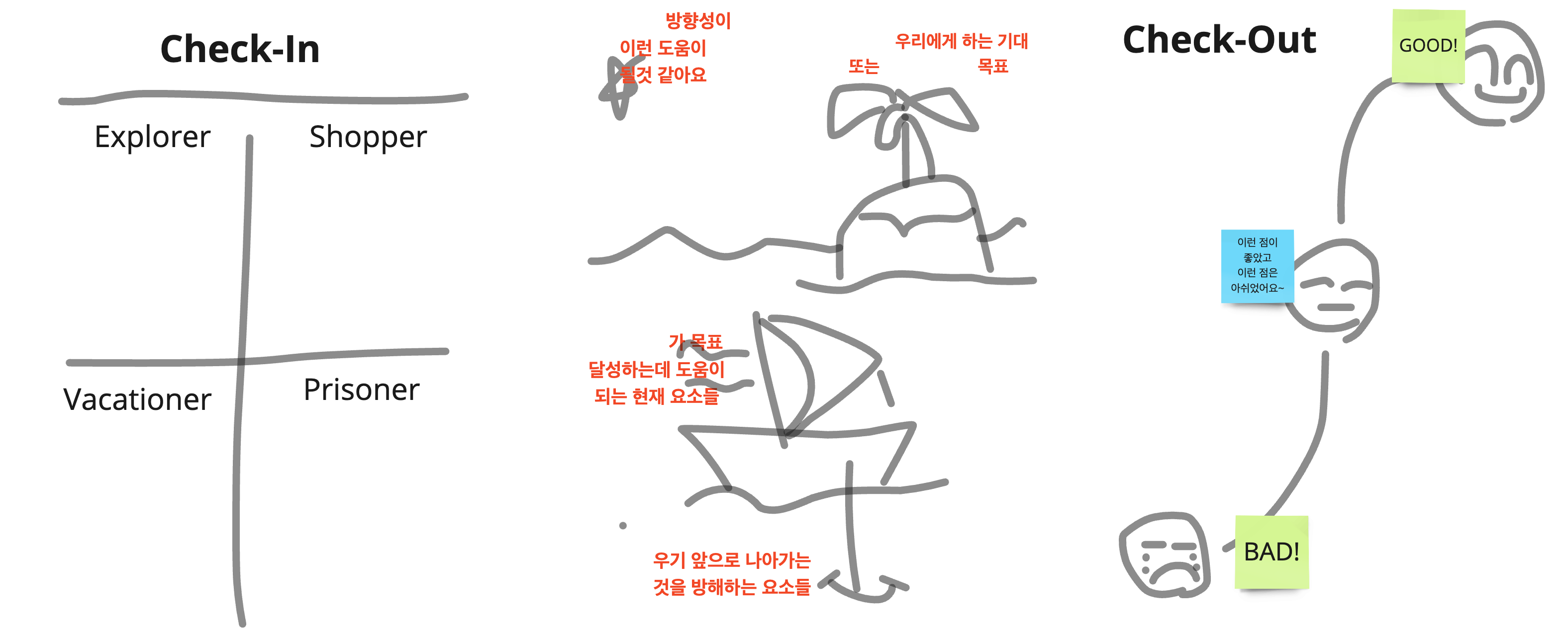 체크인은 ESVP를 활용하고, 의견 수집은 Sailing boat Retrospective를 약간 변형하여 진행합니다.